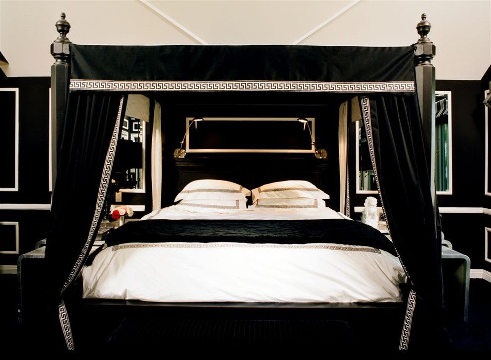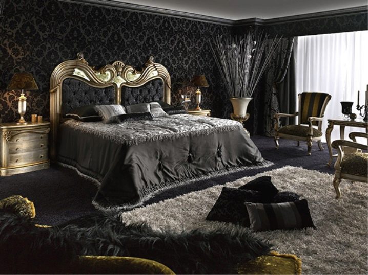 - Una camera da letto davvero regale in nero con decorazioni in foglia d'oro.
