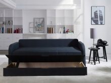 Divano-libro. È una versione classica di questo tipo di mobili. La sua parte inferiore si alza e si allunga verso se stessa, per cui la schiena si trasforma in un letto.