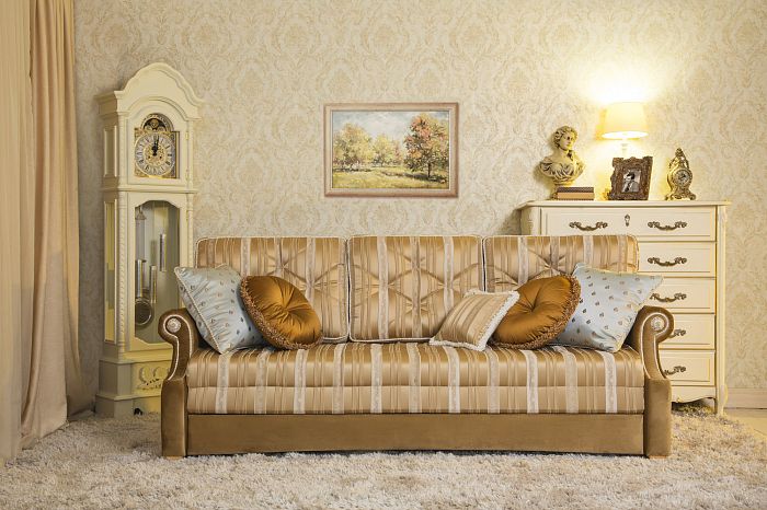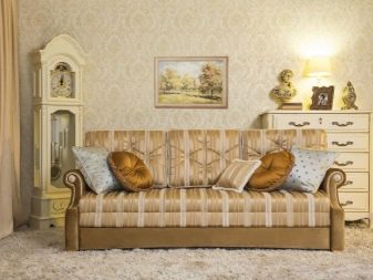 Classico. Il design di una stanza del genere si distingue per il suo aspetto attraente e la sua raffinatezza. In un tale interno, puoi utilizzare divani con belle gambe e rivestimento in tessuto. È meglio dare la preferenza ai colori pastello che sembrano perfetti negli interni classici e si adattano bene a quasi tutti i colori delle pareti.