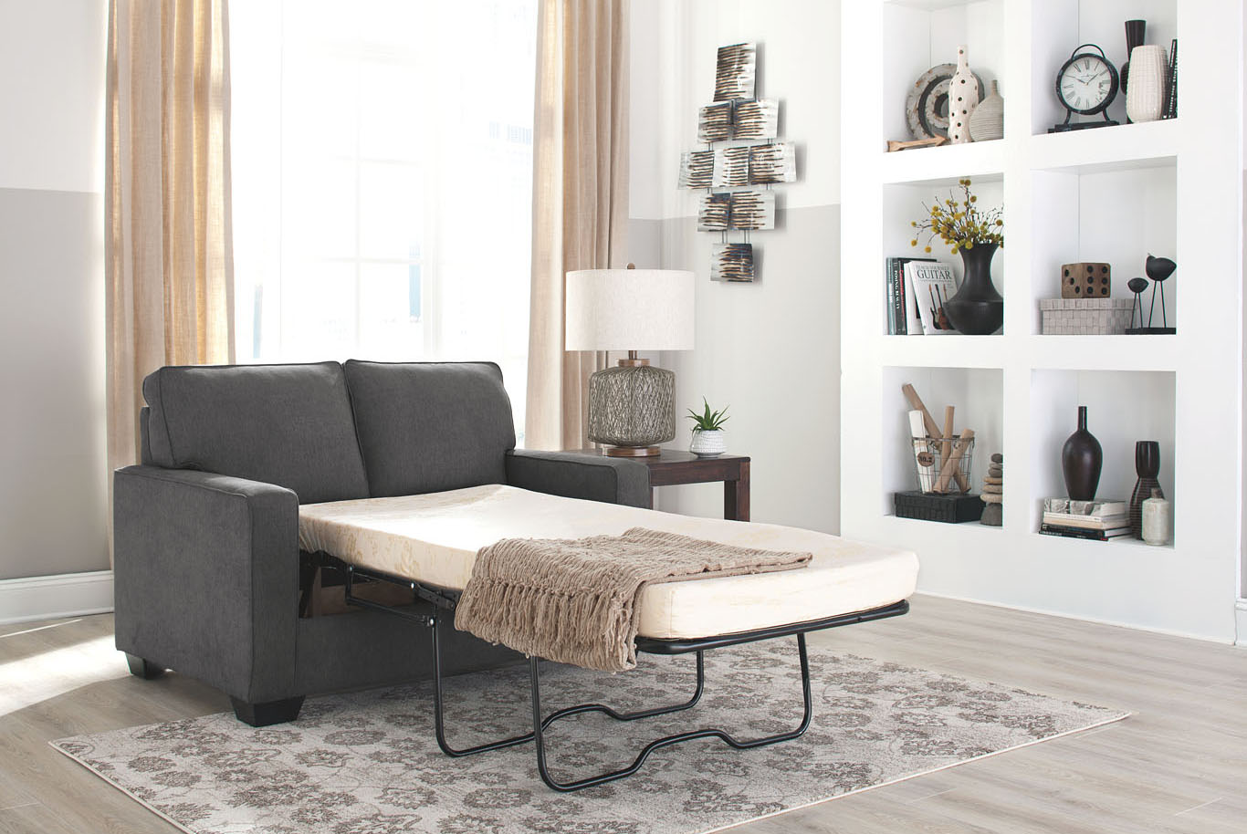 - un mini-divano grigio alla moda resistente agli atti vandalici, che i proprietari hanno deciso di posizionare vicino alla finestra;