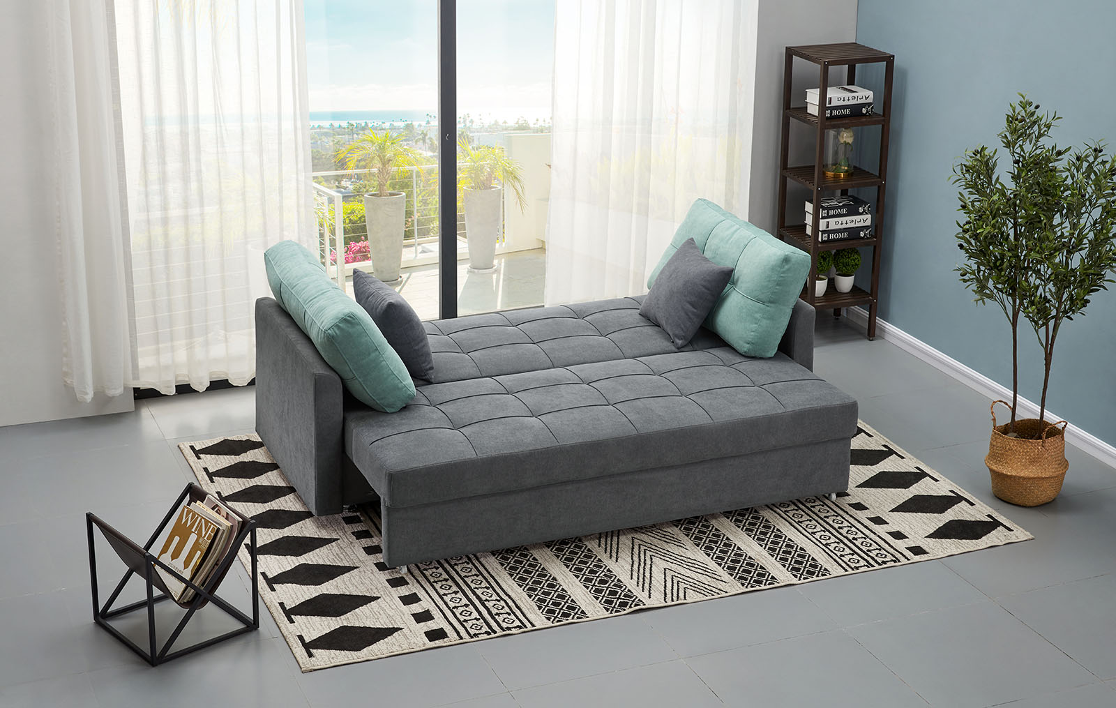 - divano blu nella camera da letto, realizzato nello stile del minimalismo;