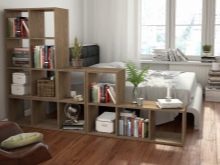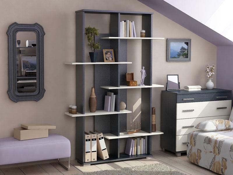 - Rack... In una spaziosa camera da letto, il rack può essere utilizzato come divisorio. Aiuterà a separare ordinatamente una stanza dall'altra. Ma molto spesso, le scaffalature, come gli armadietti, sono installate nell'angolo di una stanza o contro una delle pareti. Gli scaffali aperti sono adatti per riporre libri, vari souvenir e artigianato. Quelli chiusi vengono utilizzati in alternativa a un piccolo armadio o cassettiera.