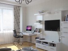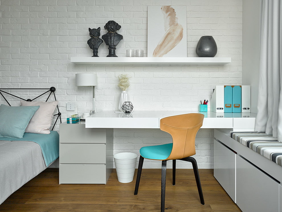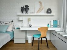 In una stanza spaziosa, decorata con colori chiari, i mobili bassi e ordinati sembrano belli. La scrivania è proprio accanto alla zona notte. Pertanto, può essere utilizzato anche come specchiera o comodino.