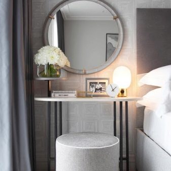 Quando organizzi una camera da letto, devi anche scegliere la sedia o il pouf giusti per la toletta. Dovrebbe essere piccolo e compatto. Se possibile, è meglio acquistare mobili che possono essere nascosti sotto il tavolo.... Ciò consentirà di risparmiare notevolmente spazio libero.
