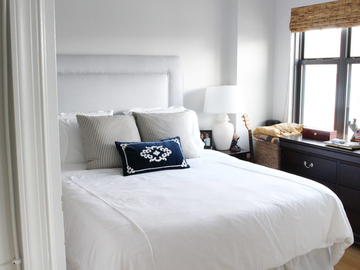 Di norma, il letto viene posizionato con la testiera contro il muro. Questa disposizione fa sentire la persona più a suo agio. E puoi anche spostarlo con le spalle alla parete di fondo di un armadio o di una cassettiera alta.