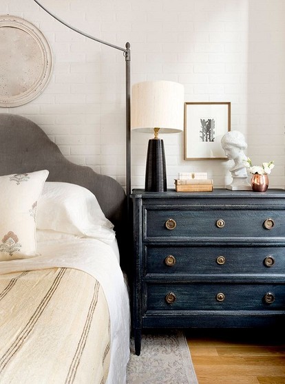 - Accanto al letto... In questo caso, la cassettiera si trova contro la stessa parete del letto. Non ostruisce il passaggio ed è adatto per riporre oggetti personali. In alcuni casi, al posto dei comodini vengono utilizzati comò bassi. Sulla parte superiore dei mobili, puoi installare una lampada da lettura e sistemare le cose che vengono utilizzate più spesso prima di andare a letto.