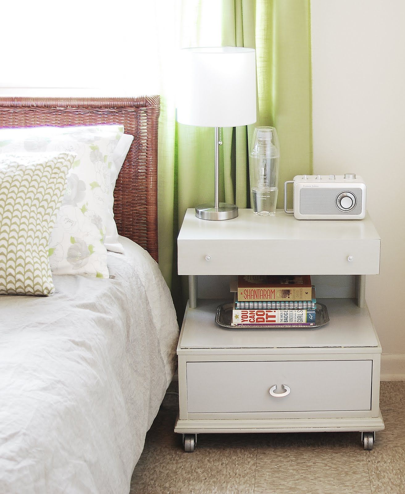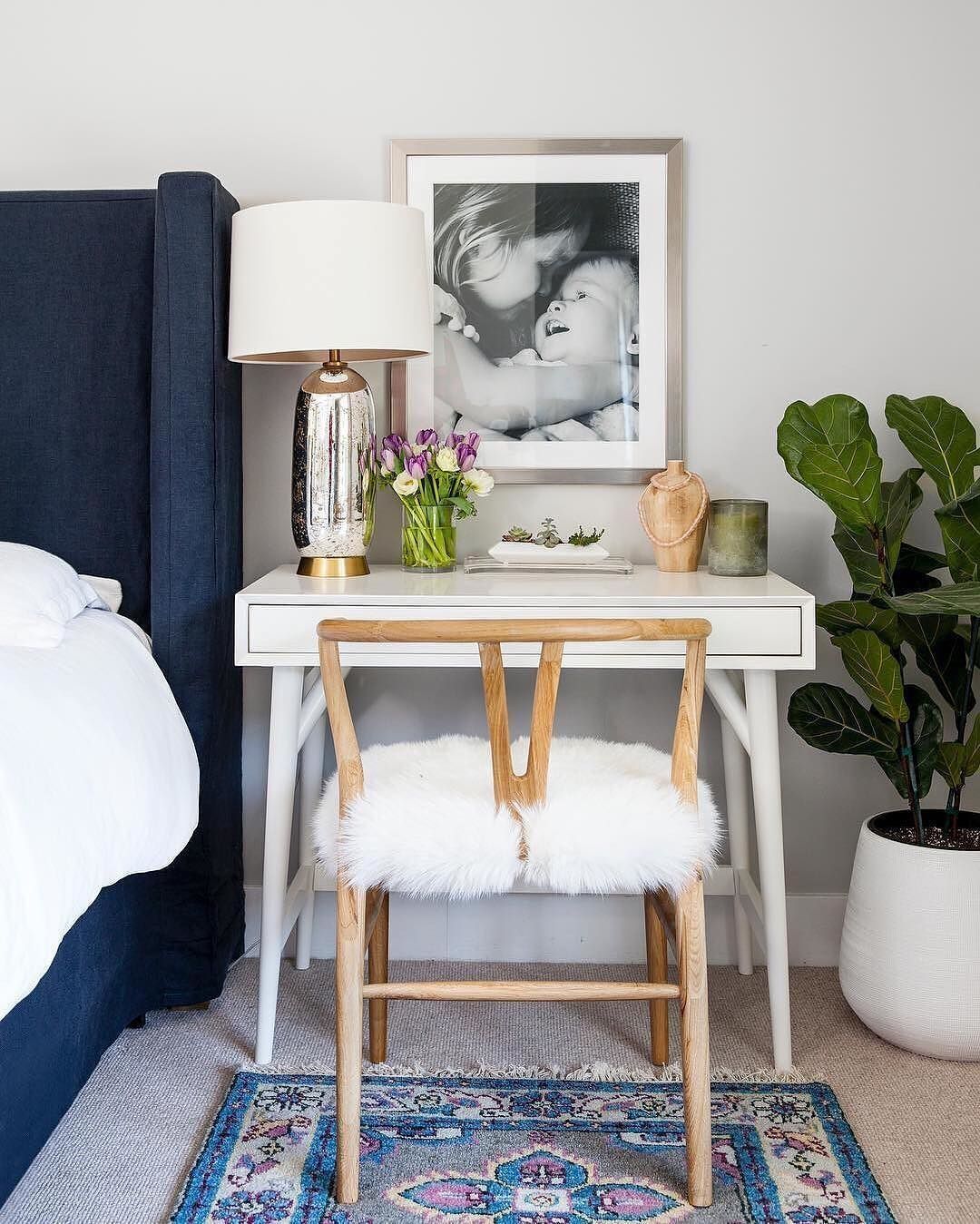 - Invece di un comodino... Di solito c'è un tavolino accanto al letto con spazio di archiviazione aggiuntivo. Questa soluzione permette di risparmiare spazio prezioso e rendere il più funzionale possibile questo tipo di arredo.