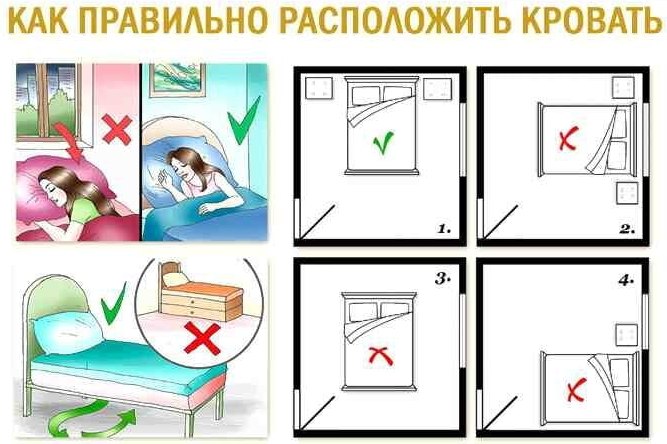 Non è consigliabile mettere il letto vicino alla finestra... In questo caso, l'aria fredda proveniente dall'apertura della finestra interferirà con un buon sonno. e non avere il letto di fronte alla porta... Tali mobili non sono installati vicino agli specchi.