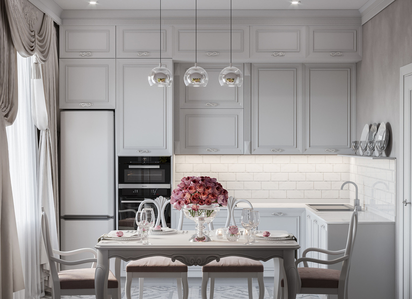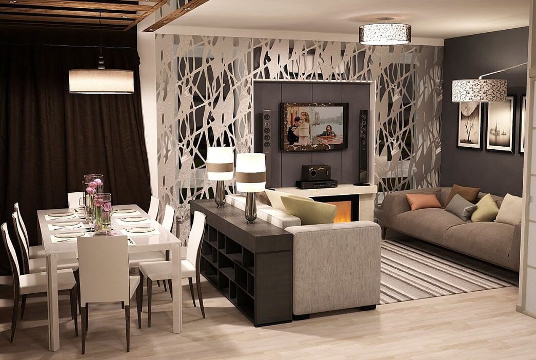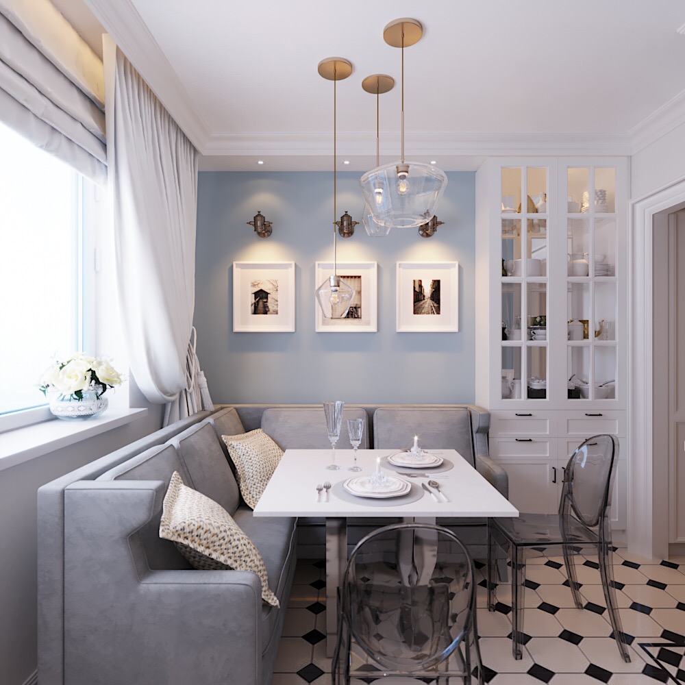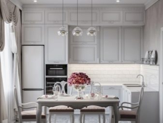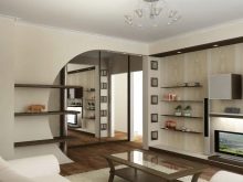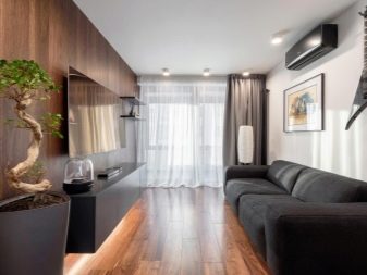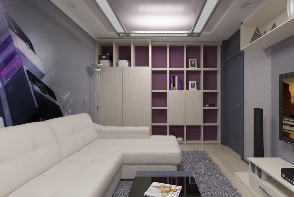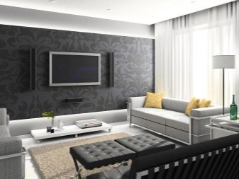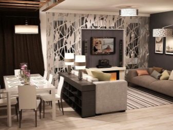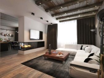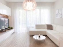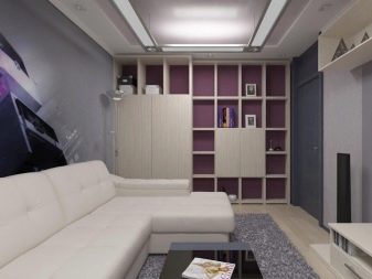 Per il soggiorno, un'ottima soluzione sarebbe quella di utilizzare un grande divano in una tonalità grigio chiaro, che offre un alto livello di comfort., e aumenterà anche visivamente lo spazio. Sopra i divani, puoi utilizzare una varietà di scaffali e scaffali, che saranno un ottimo rifugio per libri, foto e altri accessori. Se le dimensioni del soggiorno lo consentono, puoi anche installare un piccolo tavolo da pranzo, che alleggerirà la cucina e la renderà più spaziosa.