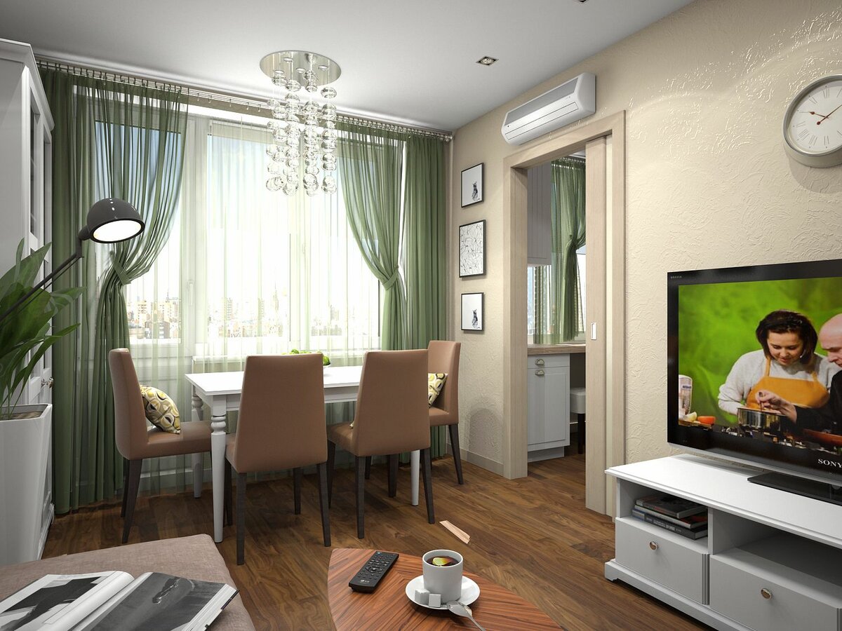Se l'appartamento è di soli 57 metri quadrati, ha senso combinare più stanze in una per ottenere molto spazio per il relax e l'intrattenimento serale.