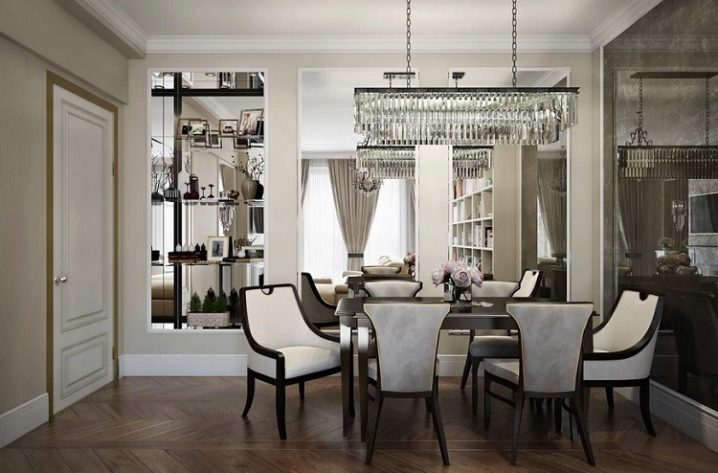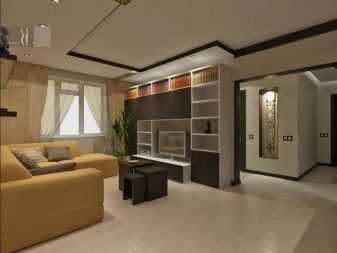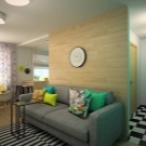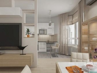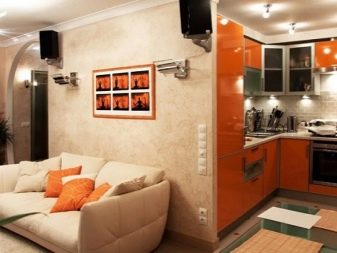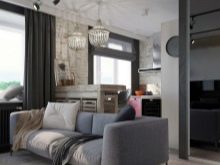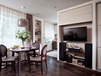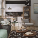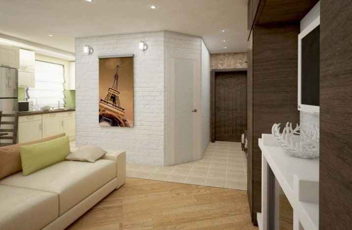 Esistono molte soluzioni per tali spazi combinati, di solito comportano l'uso di un zoner. Questa può essere, ad esempio, la differenza nei rivestimenti per pavimenti. Nell'area del cambio di spazio, il laminato passa nelle piastrelle e questa è una divisione abbastanza chiara. Se il muro viene rimosso completamente, un tale zoner è sufficiente.