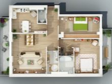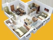 La disposizione ad angolo si trova anche nei nuovi edifici a tre stanze: una stanza in questo caso è di passaggio ed è decorata come un soggiorno. In una nuova casa, l'alloggio può essere affittato sotto forma di una scatola di cemento, senza alcuna partizione. Il proprietario ottiene uno studio spazioso con un filmato, ad esempio 85 o 90 metri, da cui forma una banconota da tre rubli a sua discrezione. Un'altra opzione premium per una banconota da tre rubli in un nuovo edificio è l'acquisto di un appartamento su due livelli.