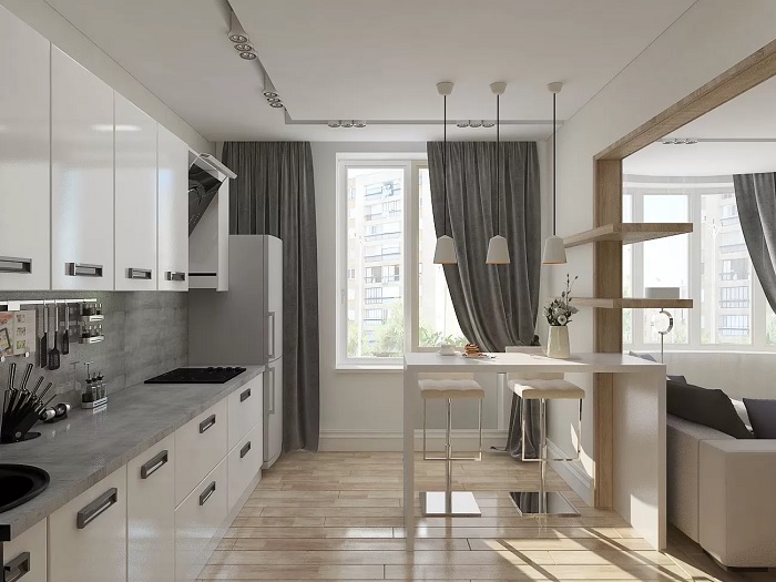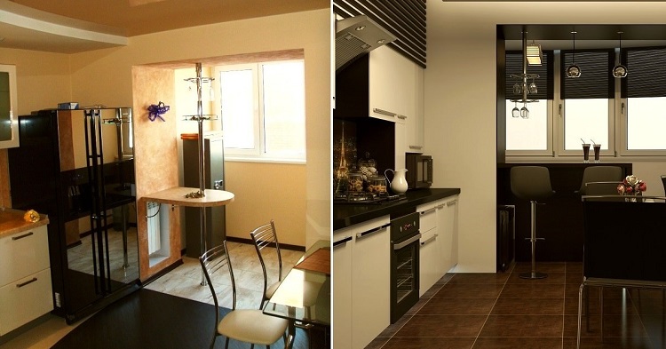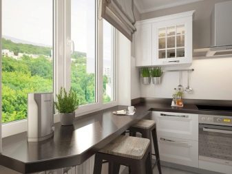 - La cucina può anche essere ampliata con un balcone. L'ex blocco di finestre che porta al balcone diventa un bancone bar. Divide la cucina ristrutturata in due parti: la seconda può avere degli armadi o anche una mini dispensa. In un angolo del balcone, puoi realizzare un mini-ufficio con tavolo, sedia, scaffali per libri e documenti. La cucina, insomma, può diventare anche uno spazio multifunzionale.