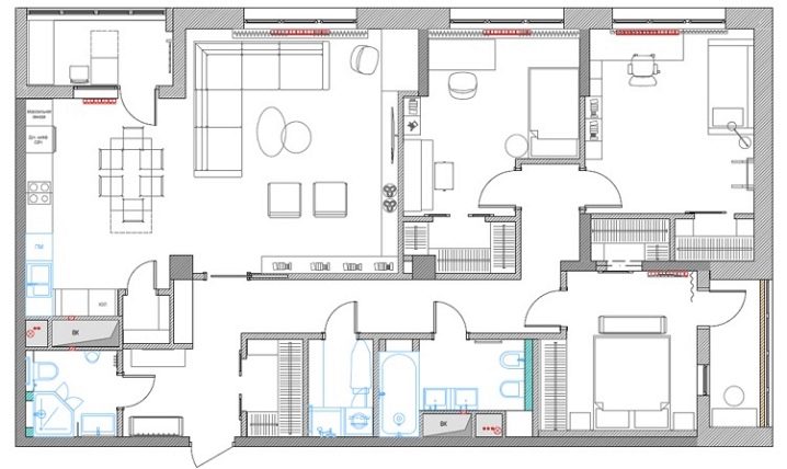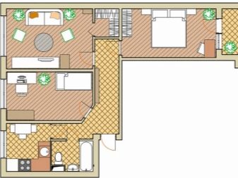 - "Veste". Al centro dell'appartamento c'è un corridoio, stanze su entrambi i lati e vanno a diversi lati della casa. Il soggiorno è di passaggio, due camere da letto adiacenti.