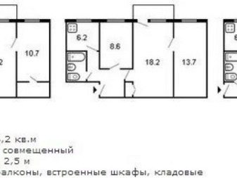 La versione più modesta di "Brezhnevka" è un appartamento di 49 metri quadrati con un soggiorno di passaggio che conduce a due camere da letto. Il soggiorno era di 17,3 metri quadrati, la cucina di 6,2. Il campione più spazioso di "brezhnevka" è una treshka di 67 quadrati, tutte e tre le stanze sono isolate, una cucina è di 6,6 quadrati, due stanze sono di 17,8 quadrati ciascuna e una piccola è di 12,6 quadrati.