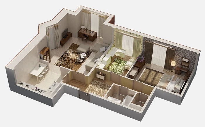Un appartamento di tre stanze è stato a lungo il gold standard per le abitazioni familiari. Questa è un'opzione comoda e conveniente, la possibilità di scegliere un layout e un numero enorme di decisioni su come smaltire i contatori preziosi e trasformarli a proprio piacimento.