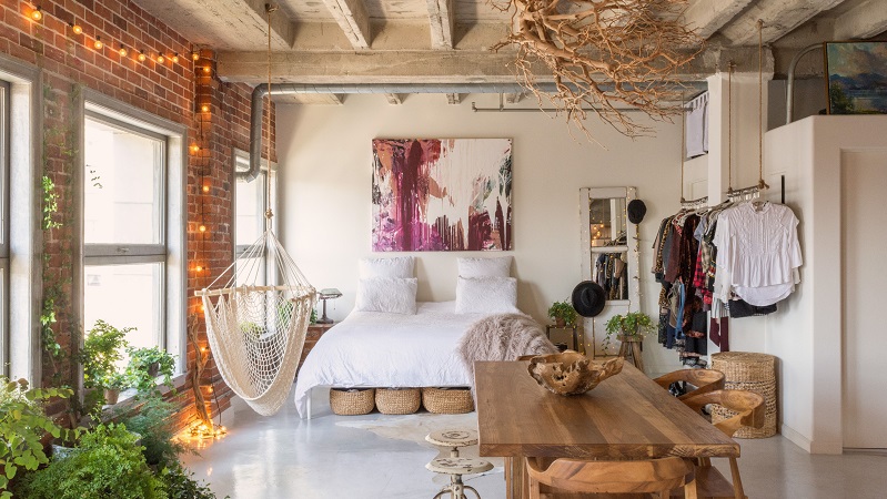 - Eco-boho. Questo è lo stile crossover che ha inondato i social media e altri siti popolari con immagini fantastiche oggi. Bello, incredibilmente armonioso, lo stile economico crea spazi luminosi con piccole cose carine su un piccolo filmato e con un budget modesto. I colori chiari sono una priorità, è richiesto un arredamento realizzato con materiali naturali: legno, bambù, fiori secchi, lino, ecc.