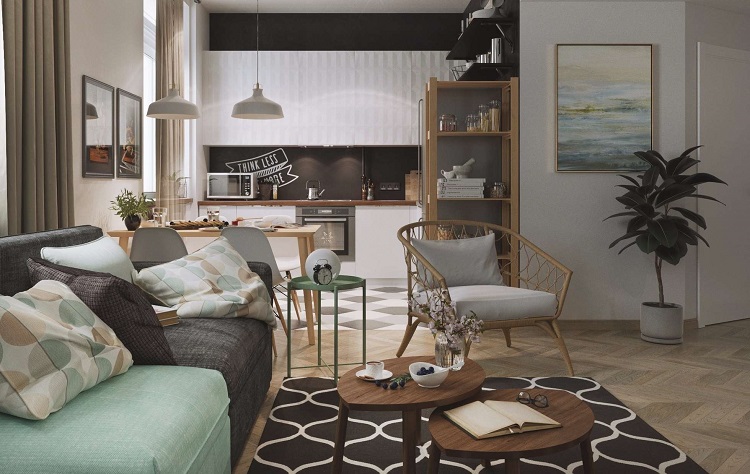 Loft cerca di non rinunciare alle posizioni, ma viene anche travolto da variazioni in stile scandi e kinfolk o scende a compromessi. Lo stile scandinavo, ormai decisamente non inferiore alla sua leadership, si stratifica in decine di volti. Qui appare come un laconico interno in bianco e nero, in cui altri colori invadono solo attraverso le piante.