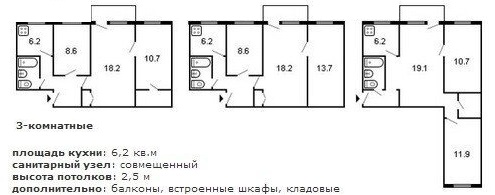 Un tale appartamento può avere un'area da 57 a 85 quadrati. Il soggiorno nell'appartamento è da 16 metri, la camera da letto e la cameretta sono da 9, e la cucina è da 7.La più preferibile per molti è la disposizione di un appartamento di 75 quadrati, una grande stanza con un metraggio di 20,3 me due camere da letto poco più di 14 m (con soggiorno di passaggio). La cucina è più di 7 M. E nella serie 1-433 (le case sono state costruite dopo il 1954) puoi trovare una "stalinka" con una superficie di 83 m con una grande cucina (8,8 mq) e tre stanze, la il più spazioso dei quali è di 18,8 metri quadrati, ma la camera da letto è quasi la stessa area e la stanza dei bambini è di quasi 14 quadrati.