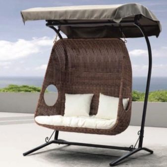 - Milù altalena. Questa altalena ha una forma simile a quella di una semplice palla. Consentono a una persona di sedersi il più comodamente possibile. La base stessa è spesso creata da un materiale di vimini resistente, esteriormente assomiglierà a un cestino. Gli elementi di fissaggio possono essere realizzati con metalli lavorati.