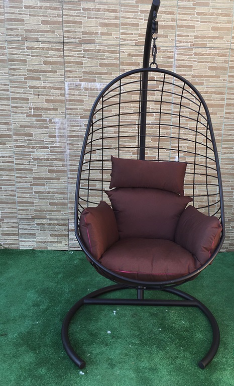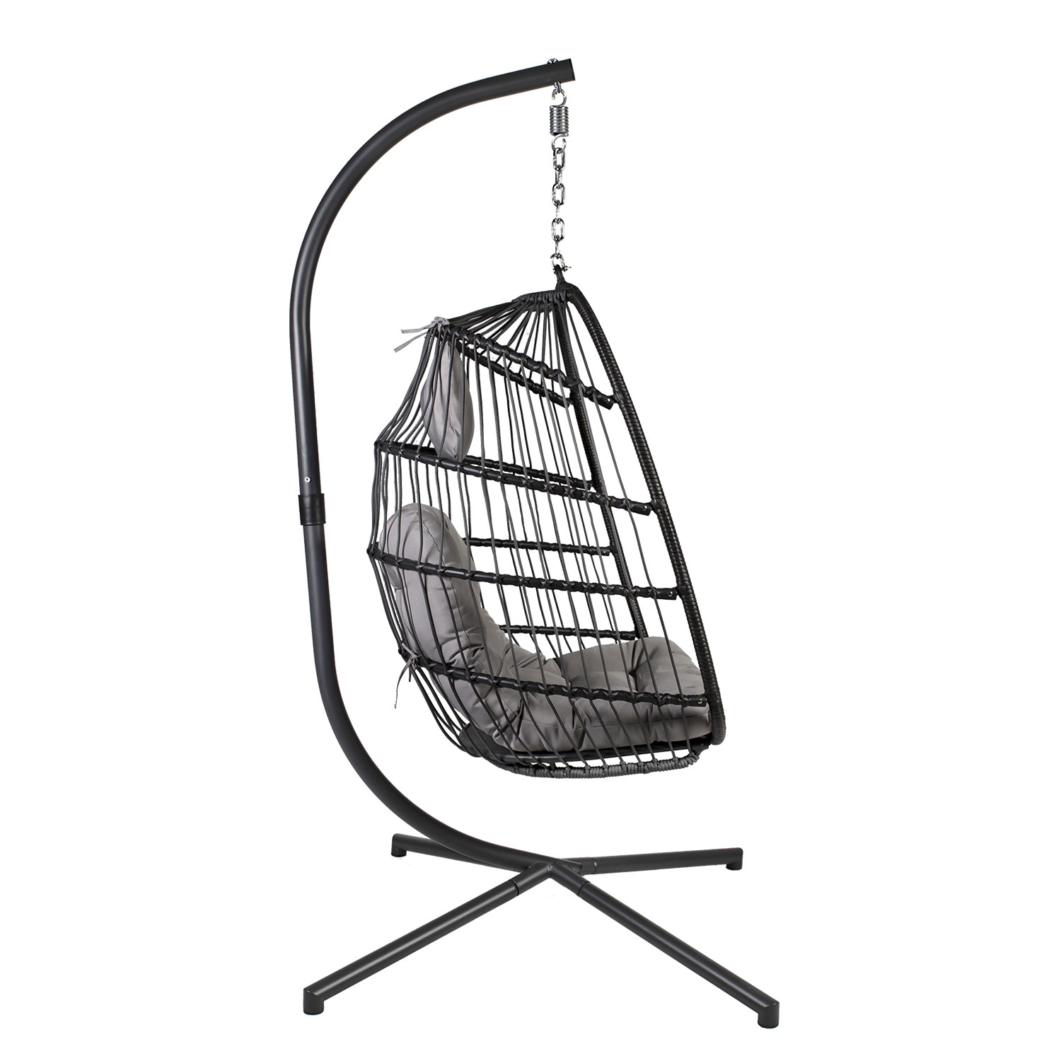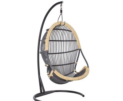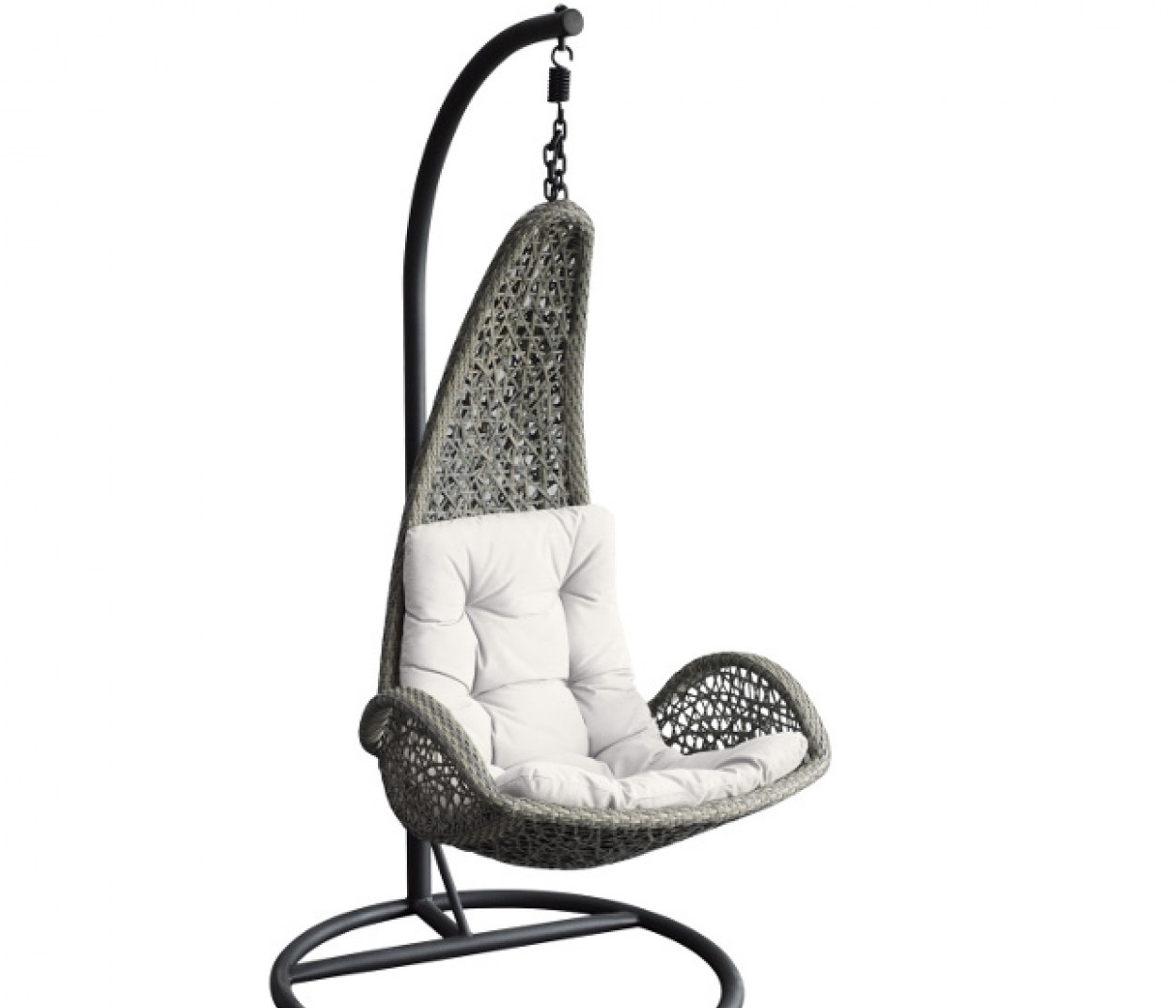 GOCCIA con cuscini. Questo prodotto è venduto anche con un supporto oscillante in metallo. Il sedile stesso è creato da elementi in plastica intrecciati tra loro. Il modello è progettato in colori grigio scuro. Viene fornito con comodi cuscini grigio chiaro.