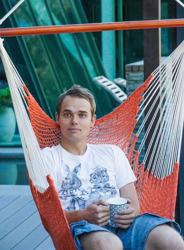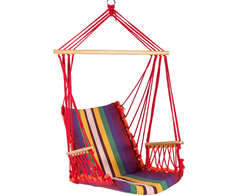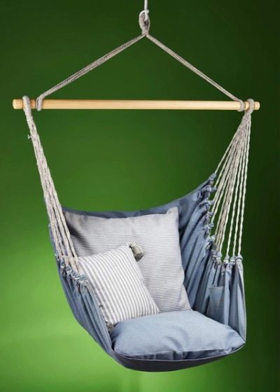 CARINA. Questo design è anche una comoda amaca a dondolo. Il sedile è realizzato in resistente tessuto di cotone bianco. La copia può essere montata a soffitto o su un rack. Questa amaca è leggera e facile da trasportare e installare.