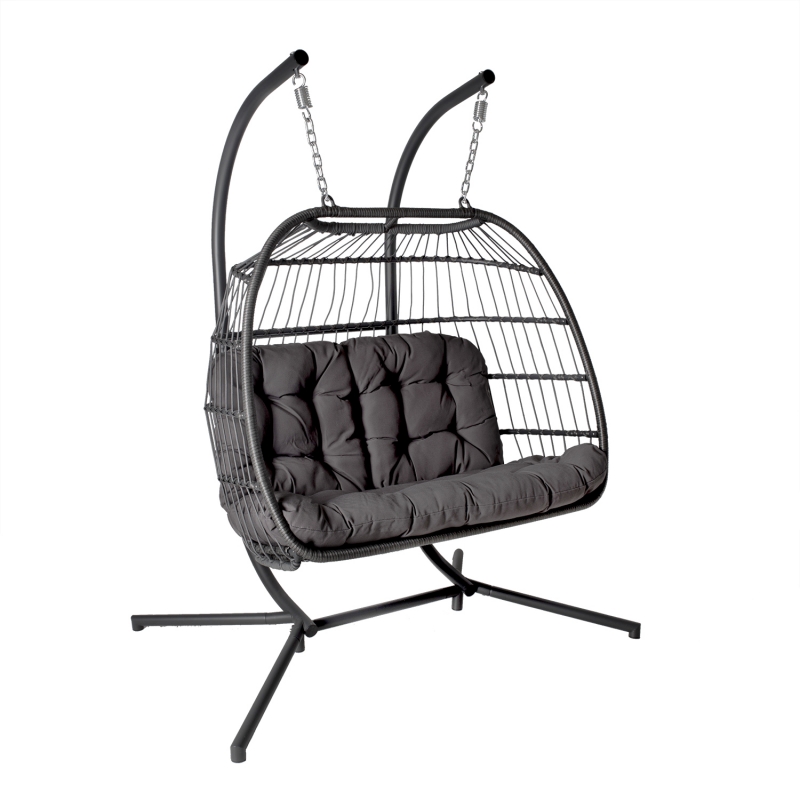 YOYO. Questo prodotto è un biposto. Ogni seduta è realizzata con un comodo e morbido cuscino. La struttura è montata su una cremagliera in acciaio. Questo tipo di altalena è dotato di una base in plastica. Il modello è progettato nei colori neri.