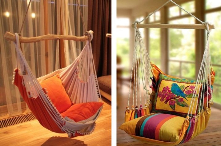 Modelli di altalena per bambini. Sono di piccole dimensioni, sono attaccati al soffitto. Queste opzioni sono spesso realizzate sotto forma di amache morbide. I prodotti per bambini sono realizzati in colori vivaci con vari motivi.