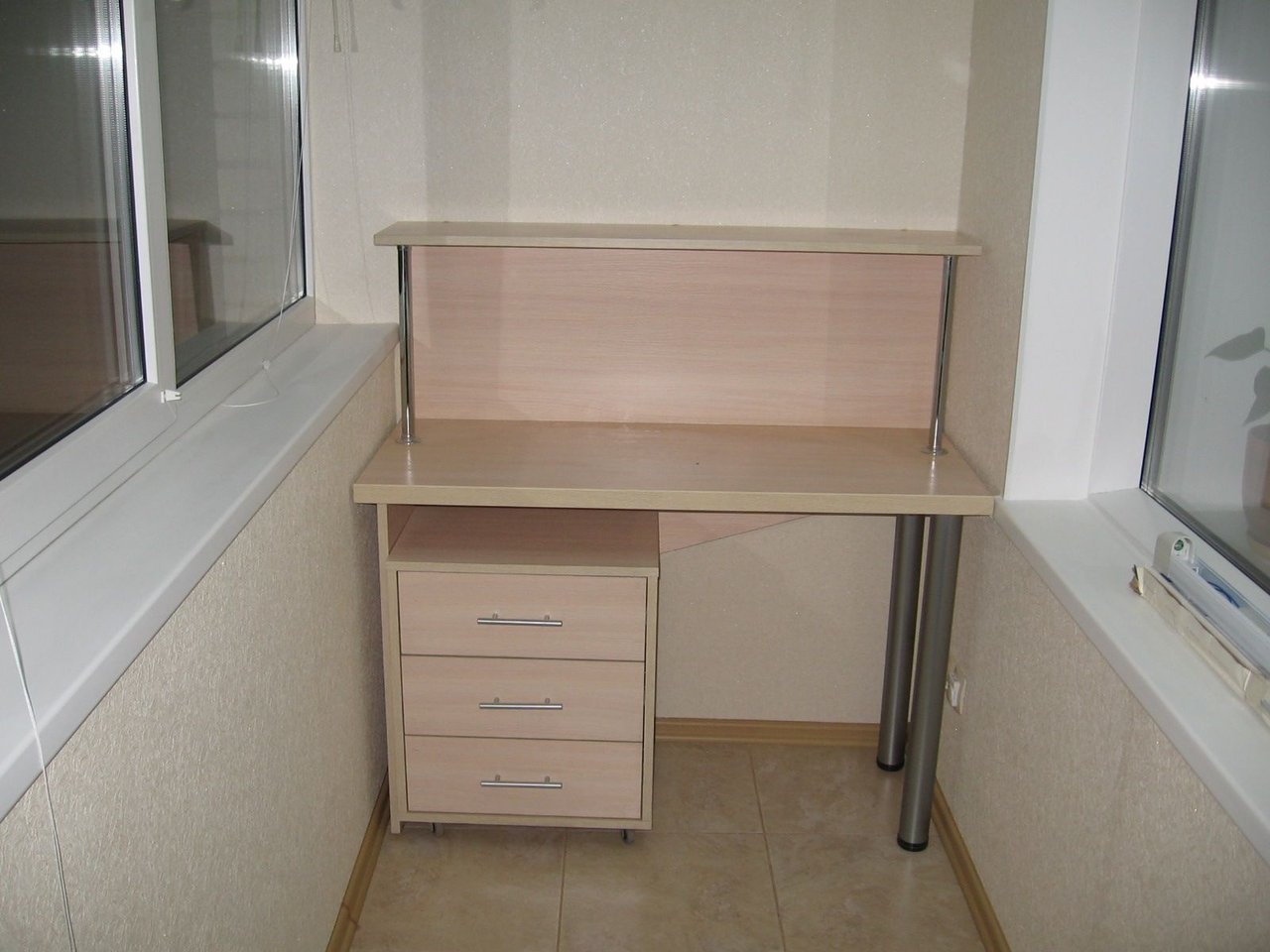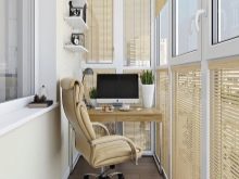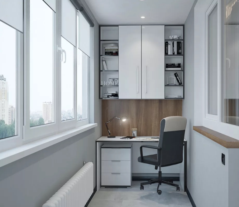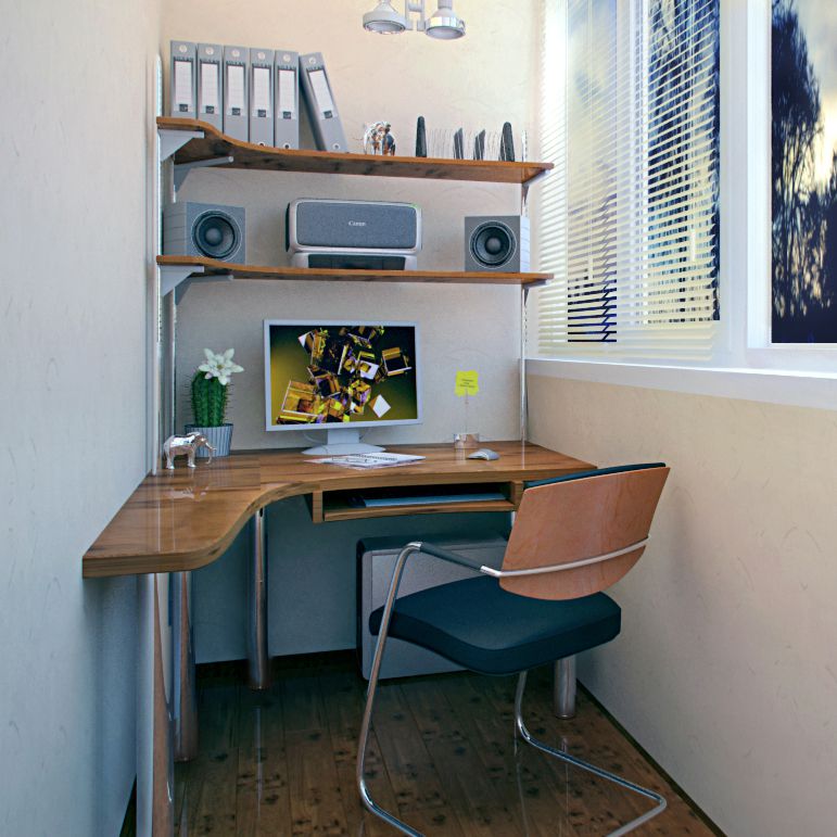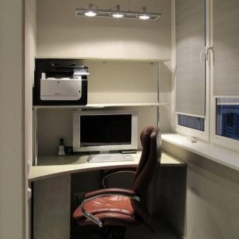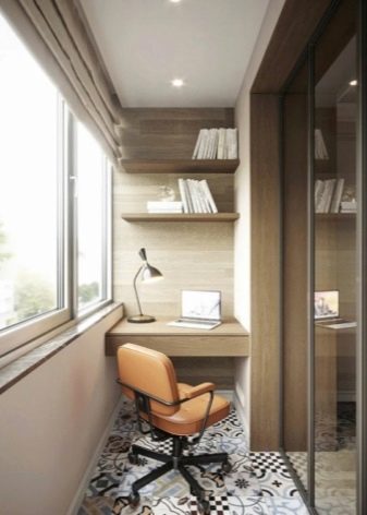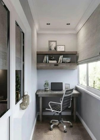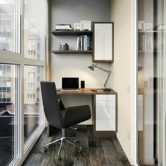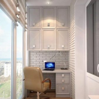 Il layout su balconi completamente vetrati è il più semplice possibile. Per il lavoro diurno, non è nemmeno necessario fornire l'illuminazione.Il posto per riporre le cose necessarie a volte è assegnato sotto il tavolo. Infine, puoi anche attaccare un piano di lavoro a un davanzale (anche stretto). Viene selezionato tenendo conto dell'equilibrio tra pesantezza e fragilità.