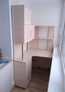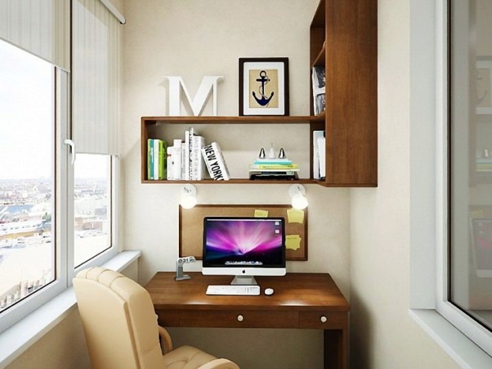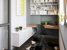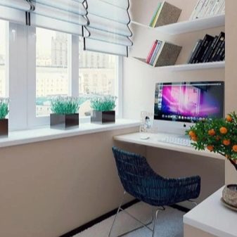 Scrivania per computer sul balcone può essere installato separatamente o integrato... I mobili finiti non richiedono lavori di installazione aggiuntivi. È senza pretese e può essere spostato in qualsiasi punto del balcone secondo necessità o spostato in un'altra stanza. Tuttavia, questo vantaggio è in qualche modo oscurato dalla necessità di selezionare attentamente le dimensioni, altrimenti lo spazio sulla loggia potrebbe essere sovraccaricato sia visivamente che fisicamente.