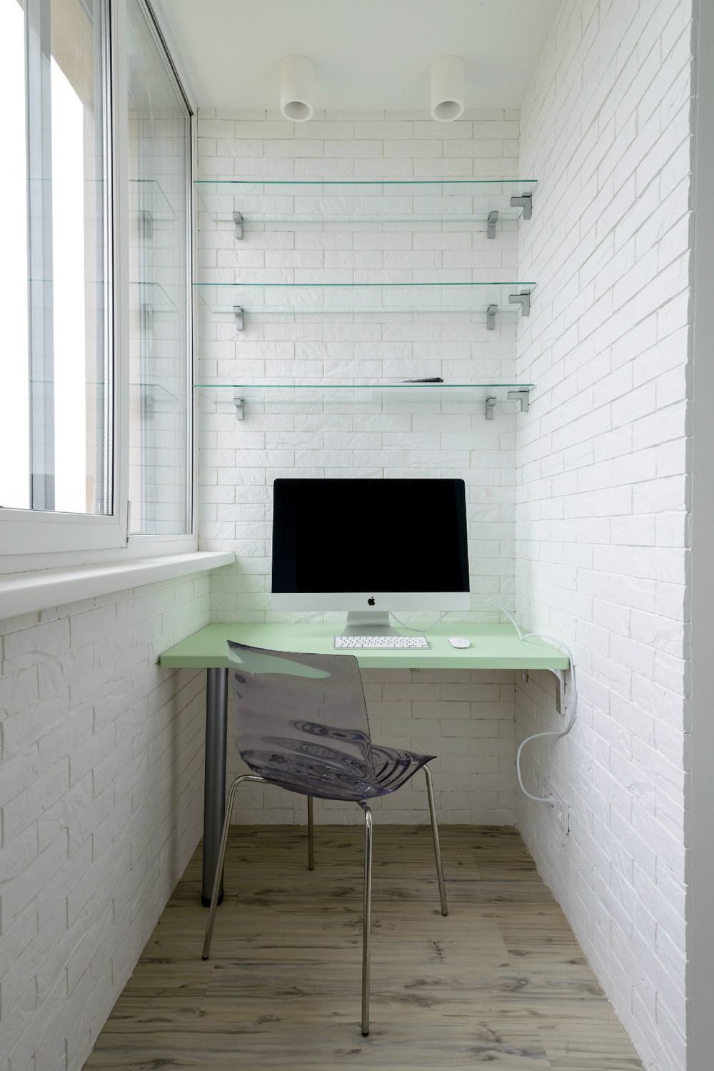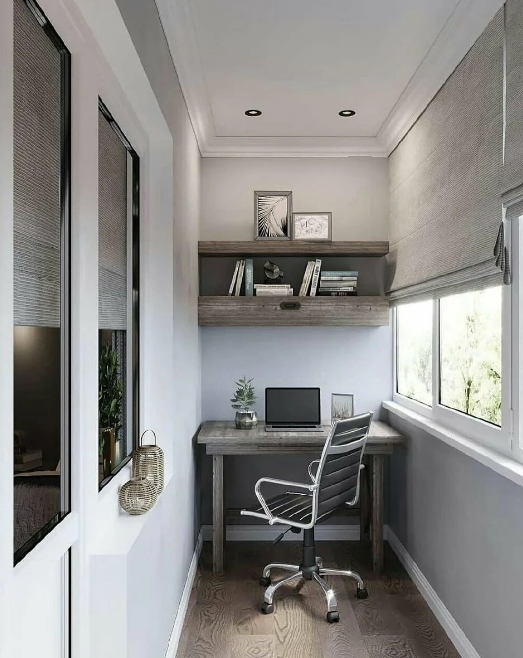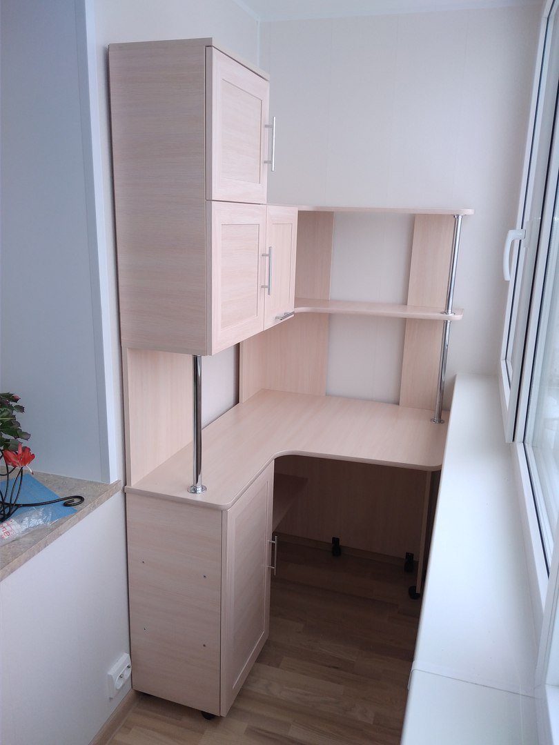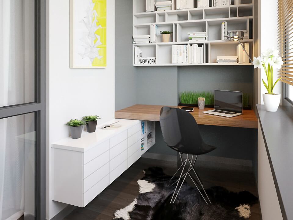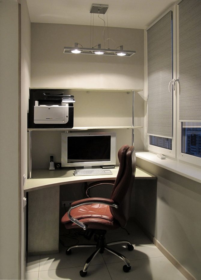 Ecco come potrebbe apparire un posto di lavoro decente su un balcone stretto. Lo spazio è decorato con i colori più chiari possibili.