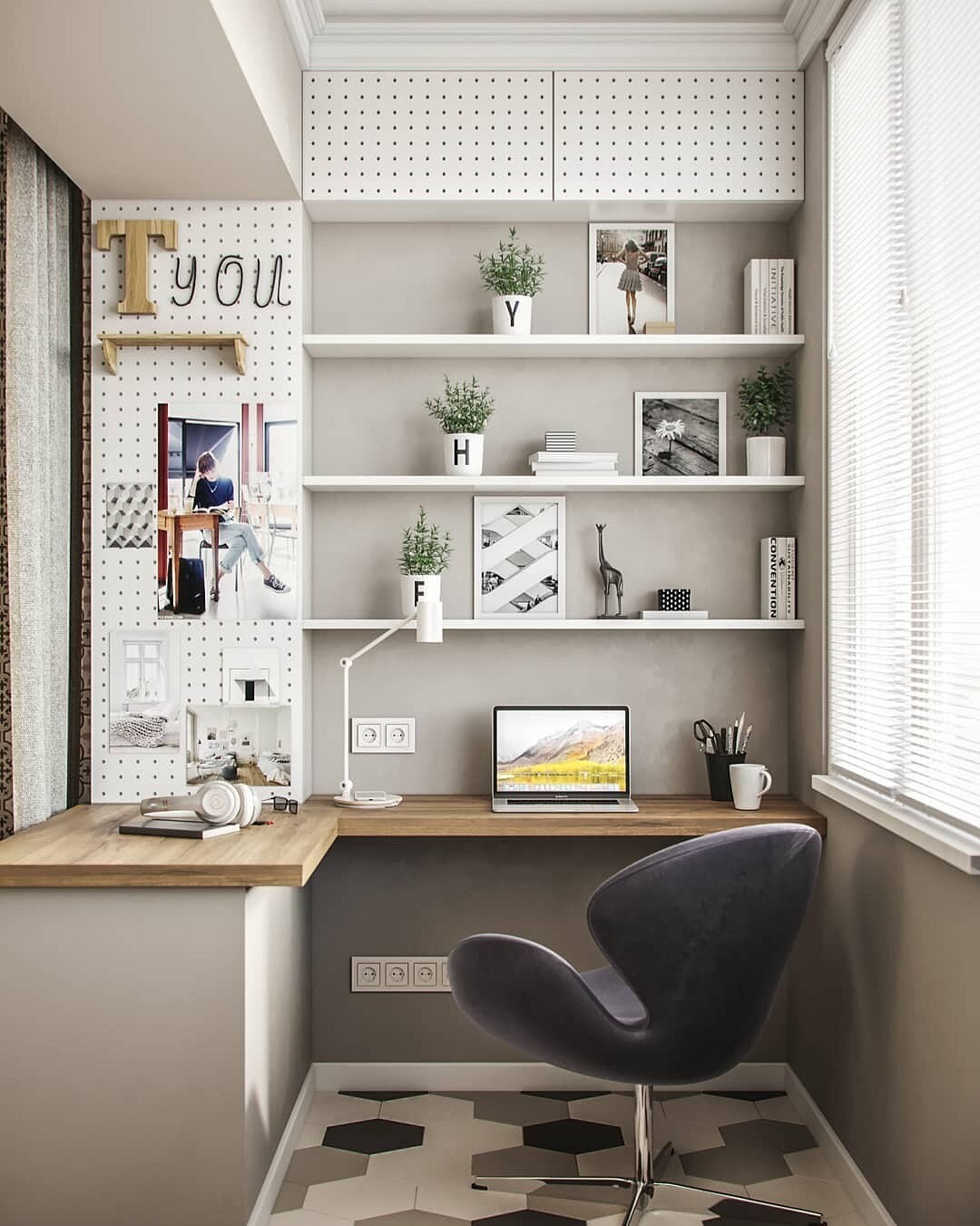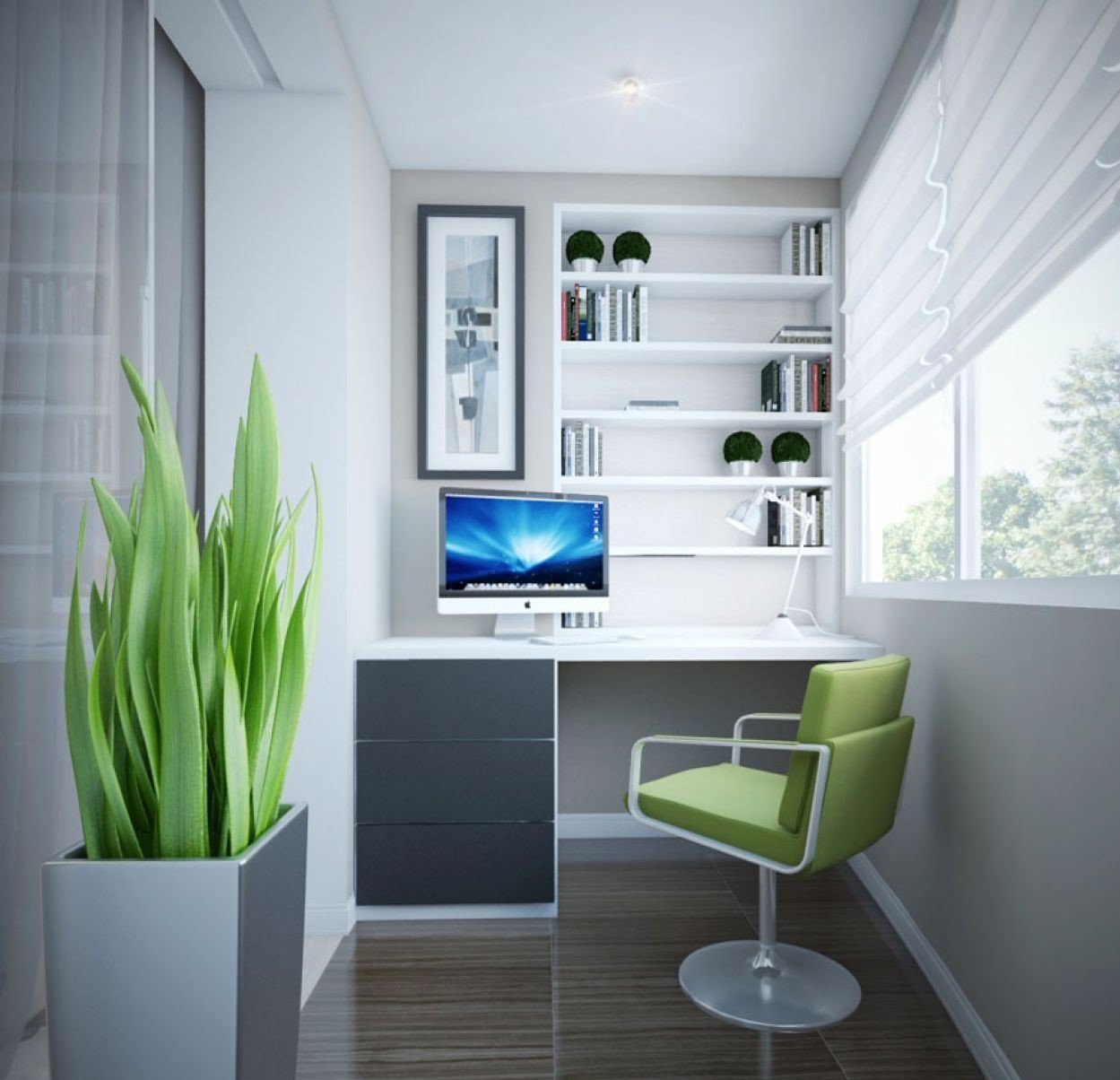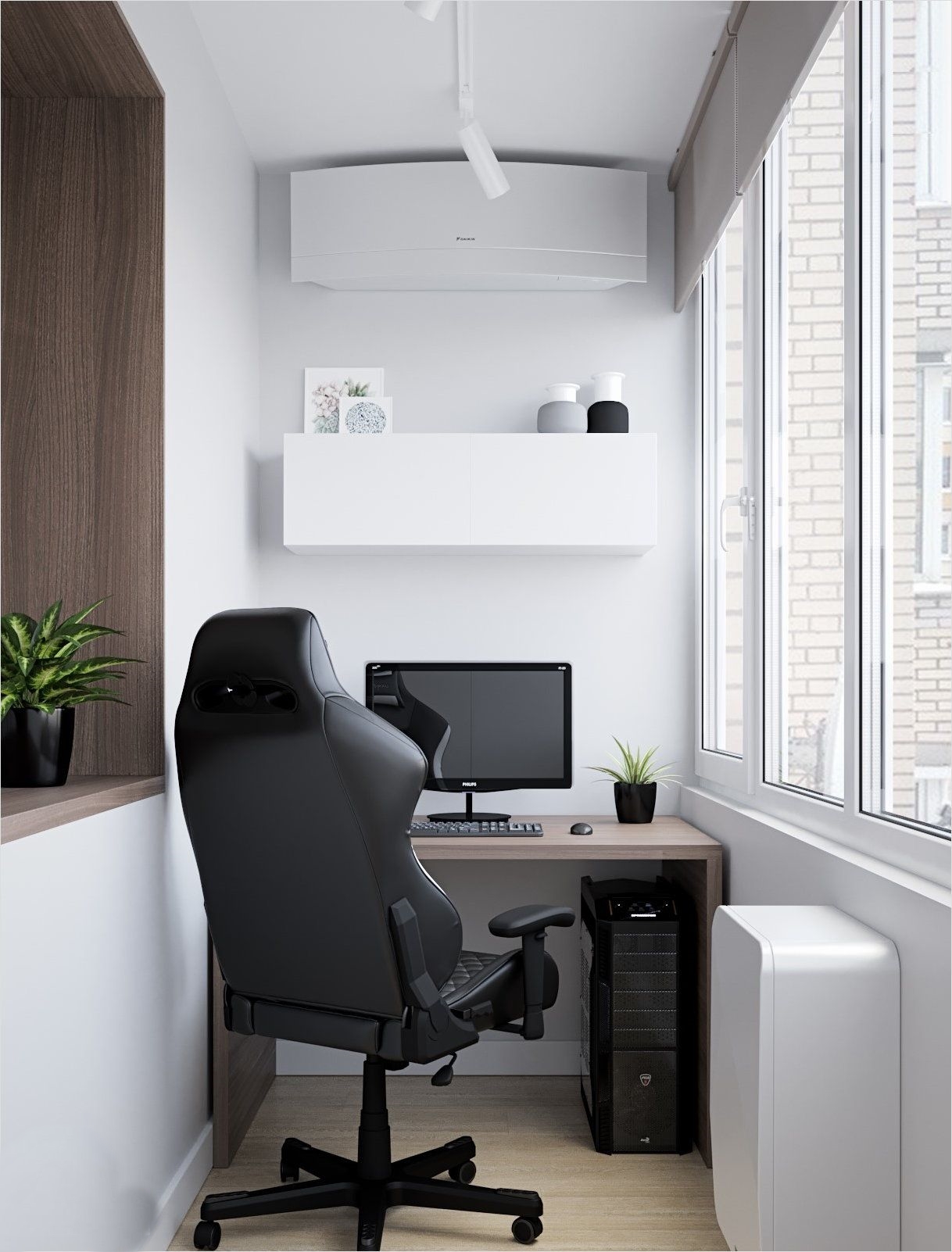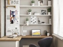 Ecco come potrebbe apparire un posto di lavoro decente su un balcone stretto. Lo spazio è decorato con i colori più chiari possibili.