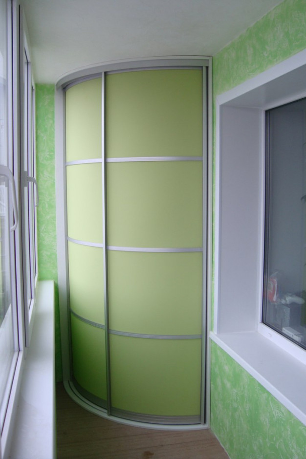 - Angolare... Questa opzione ti consente di occupare tutta la parte utile dello spazio sul balcone. Allo stesso tempo, le strutture stesse non occupano molto spazio. Uno dei tipi di tali armadi è un tipo di scomparto angolare diagonale, che ha una facciata arrotondata, spesso decorata con un grande specchio o vetro.