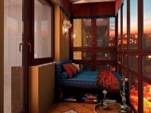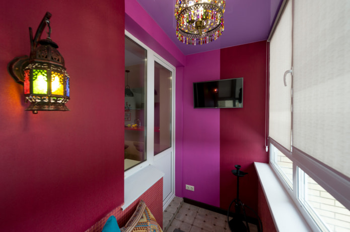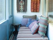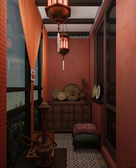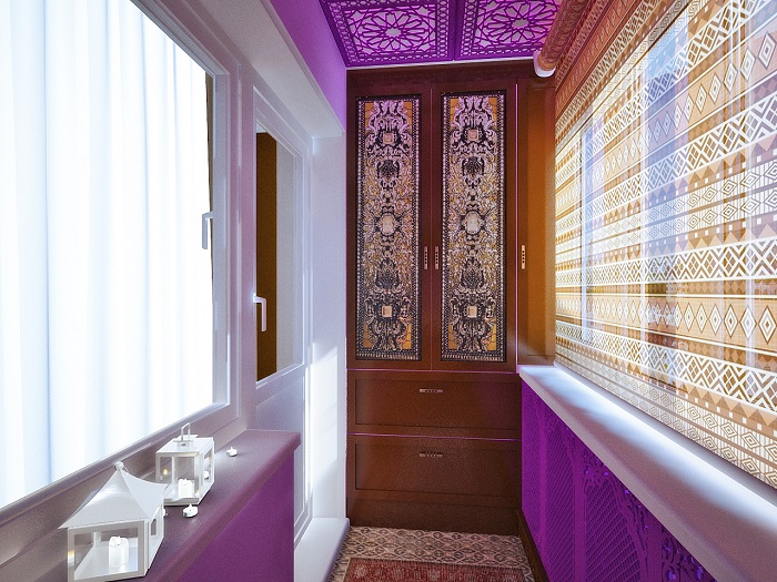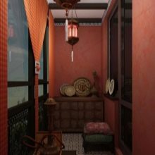 - Un'altra idea interessante: attrezzarsi sul balcone Angolo di riposo in stile marocchino, con un'abbondanza di cuscini luminosi, motivi etnici. In questo caso, non è vietato scegliere per dipingere le pareti vernice rossa, blu, terracotta o viola. Tuttavia, è importante osservare il senso delle proporzioni ed essere in grado di combinare il colore "pretenzioso" con l'arredamento, in modo che l'etnia non si trasformi in lurida e di cattivo gusto.