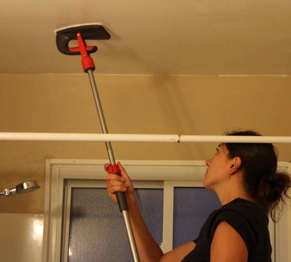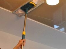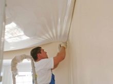 Semplicità del lavoro preparatorio. Non è necessario eliminare la decorazione del soffitto esistente, a condizione che non si sbricioli. Anche mobili e altre cose non dovrebbero essere spostati.