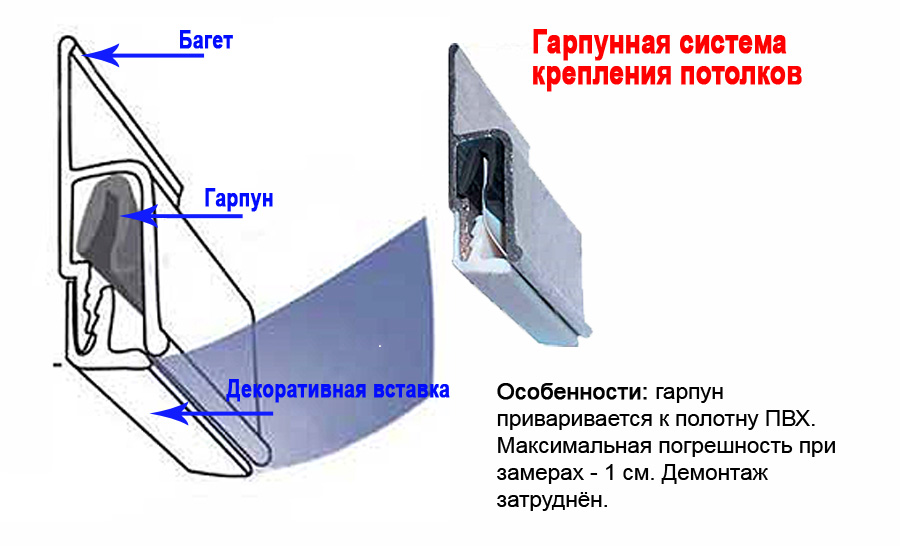 Il principale svantaggio del metodo arpione è l'alto costo degli elementi di fissaggio... E vale anche la pena considerare l'importanza delle misurazioni: il taglio della tela viene eseguito nello stabilimento di produzione e quindi l'errore commesso durante le misurazioni non può essere corretto.