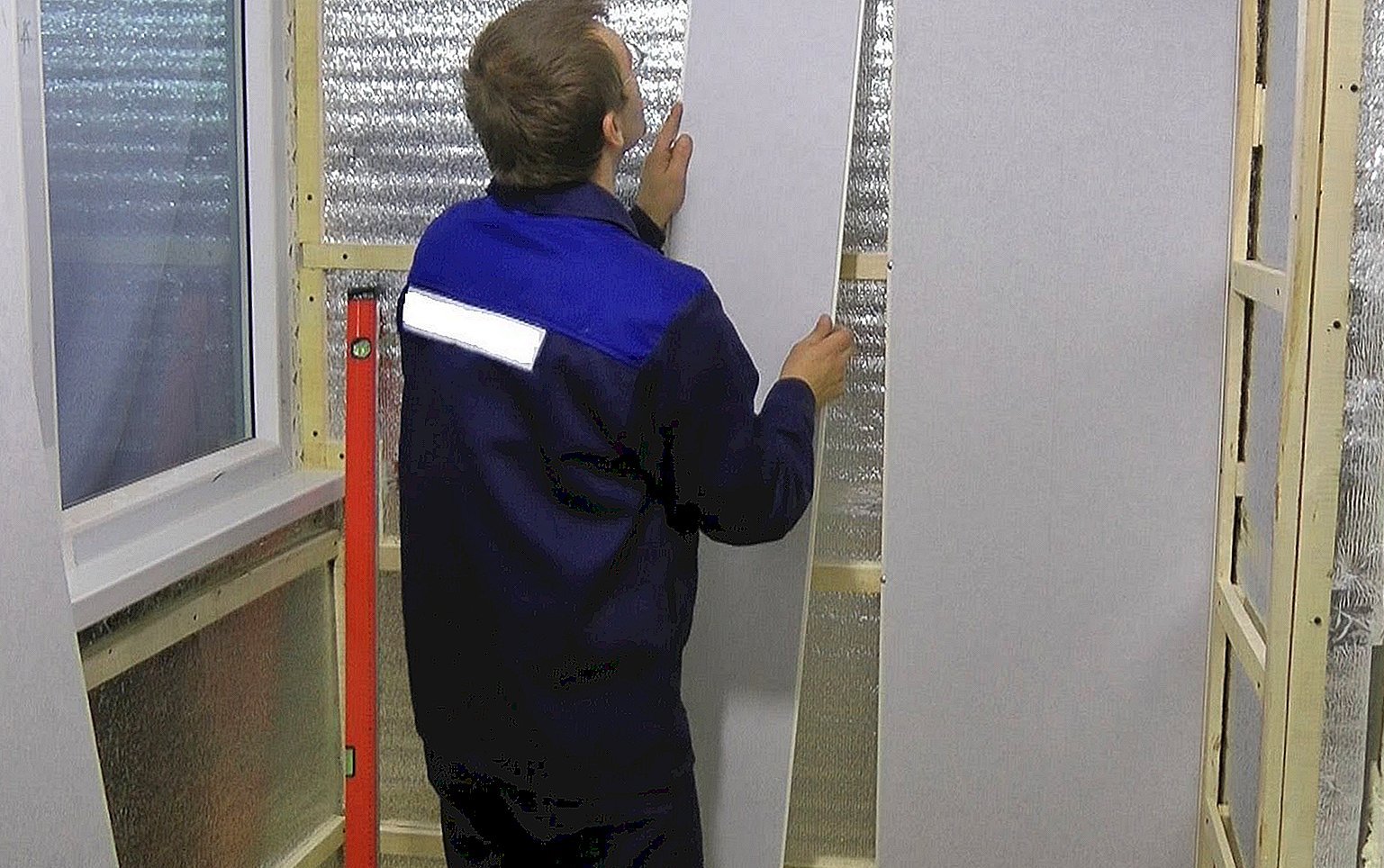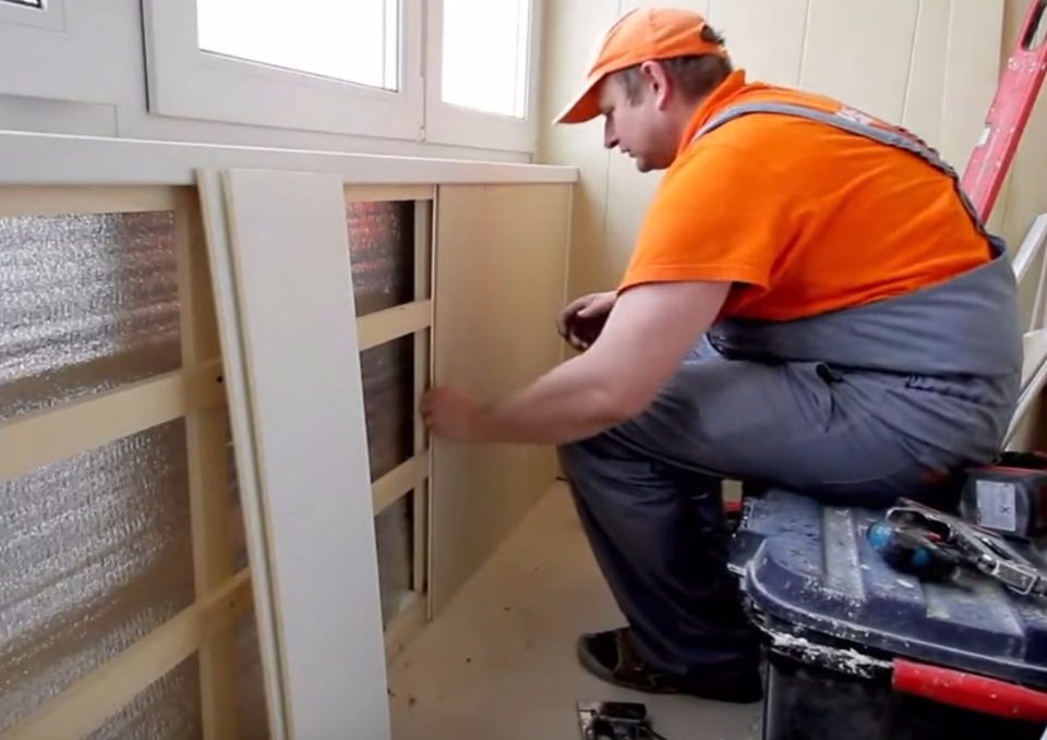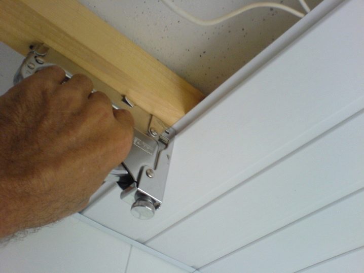 All'interno del balcone, le strutture possono anche essere inchiodate alla cassa di legno. Ma questo approccio è negativo in quanto non sarà possibile smantellare l'intero prodotto in futuro. Se anche l'installazione con i morsetti non ti soddisfa, puoi provare a guidare le graffette con una cucitrice meccanica. Iniziano con l'installazione dei raccordi. Per i pannelli di grandi dimensioni che coprono l'intera parete dall'alto verso il basso, è necessario installare uno zoccolo a soffitto.