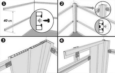 Questi tasselli ti permetteranno di installare profili metallici guida o listelli di legno. Le lamelle nelle guide sono posizionate con incrementi di 0,4 M. È possibile avvicinarle, ma è categoricamente sconsigliato allontanarle maggiormente. I profili alle guide devono essere fissati rigorosamente con un angolo di 90 gradi, altrimenti non funzionerà efficacemente per rivestire il balcone.