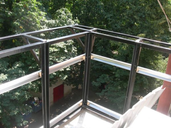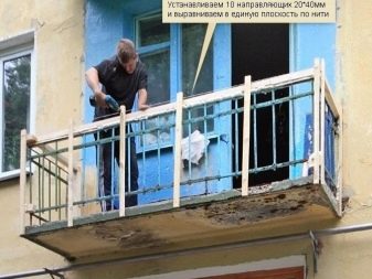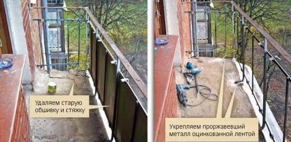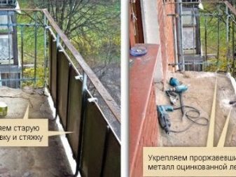 Nella fase preparatoria, è importante ispezionare la base del balcone. Se crolla, vengono rilevati trucioli, si consiglia di chiuderli, rafforzarli con gli angoli. All'incrocio con la piastra, la recinzione in acciaio è rinforzata con una striscia di metallo zincato.Tutte le superfici vengono pulite, trattate con primer e composti anticorrosivi. Solo dopo puoi procedere con ulteriori lavori.