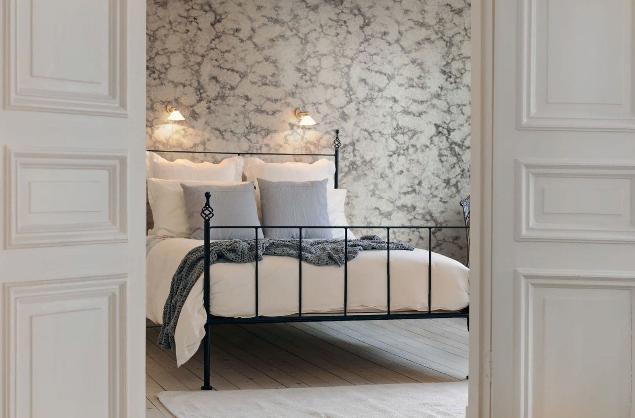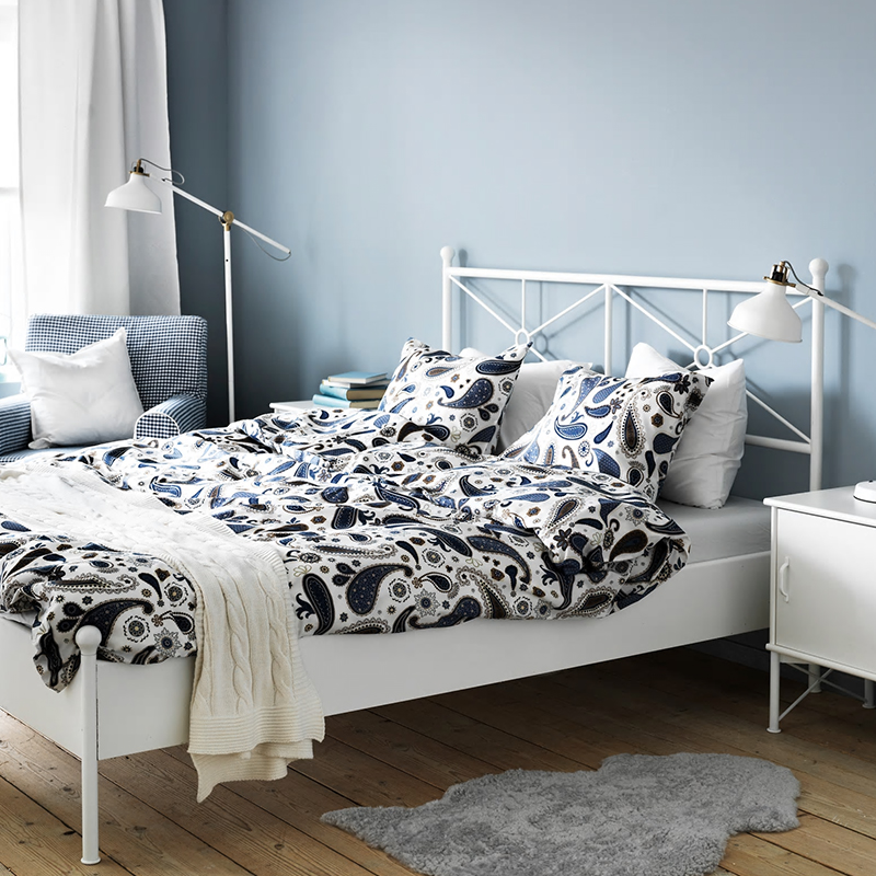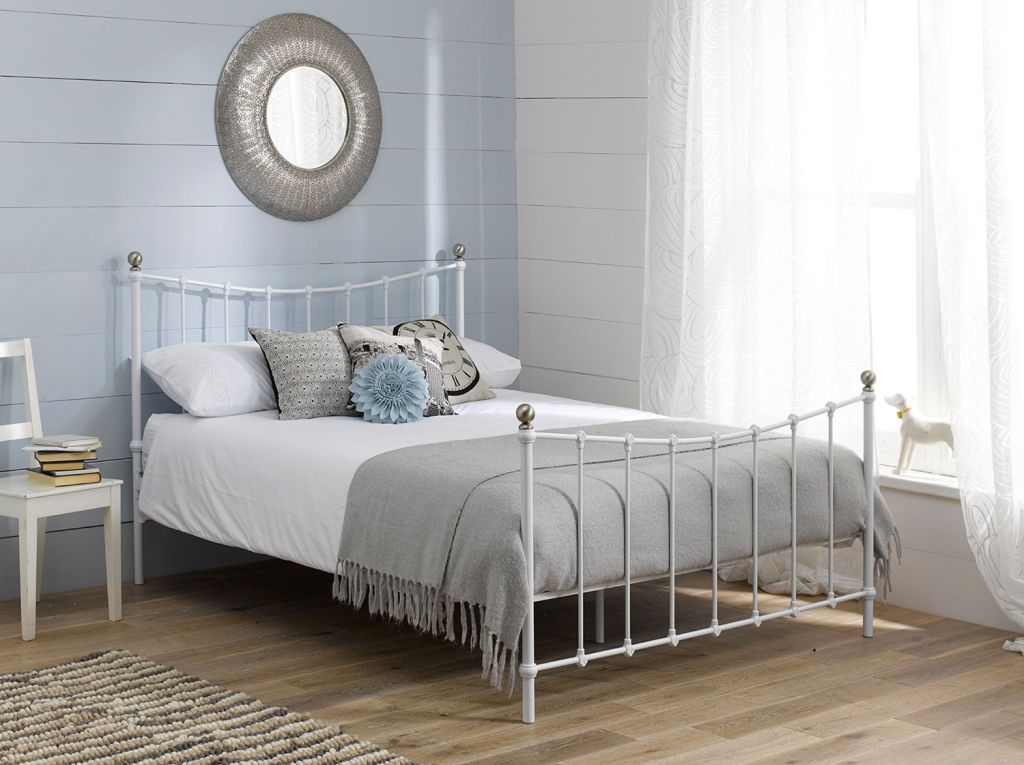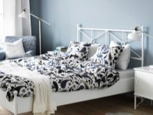 - Letto con testiera in ferro battuto. Puoi scegliere qualsiasi forma e design della testiera. Questi possono essere motivi floreali, qualsiasi motivo o ornamento. Questa soluzione contribuirà a rendere più romantico lo stile scandinavo.