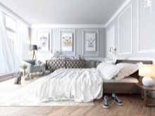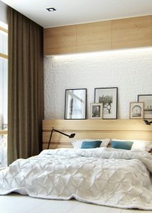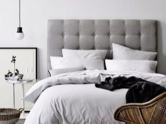 - La camera da letto è decorata con un semplice design doppio rettangolare con testiera morbida e gambe in legno. Il modello color cenere non rovina affatto l'interno, al contrario, si adatta perfettamente al design.