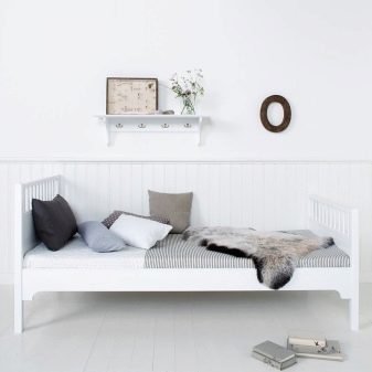 Il letto in una cameretta scandinava non deve essere troppo grande, per non finire per occupare tutto lo spazio libero della stanza. Quando si sceglie un doppio design, si dovrebbe dare la preferenza ai modelli 160 per 200 o 140 per 200 mm.