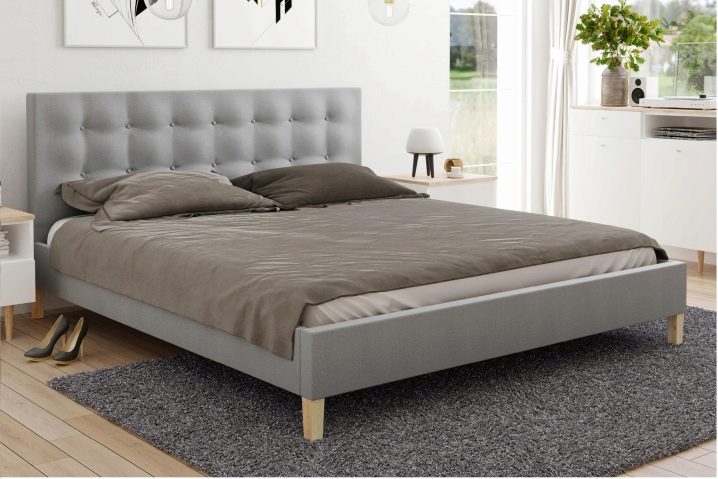 Letto morbido con testiera alta. Sarà un'ottima decorazione per una camera da letto scandinava. Le gambe del prodotto sono realizzate in legno, che enfatizzerà perfettamente lo spirito dello stile nordico. I tessuti naturali di tonalità fredde vengono solitamente utilizzati come materiale per la testiera.