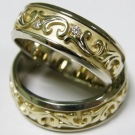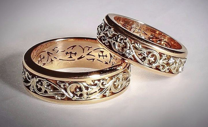 - Design originale). Questo tipo di fedi nuziali si distingue per il suo aspetto accattivante e straordinario. Tali prodotti possono essere realizzati mediante forgiatura, fusione, tessitura sottile traforata. La loro superficie può essere lucida o opaca, strutturata, modellata.
