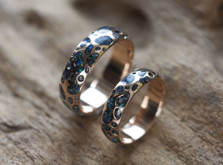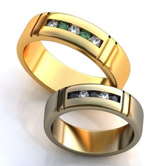 Più spesso usato per le fedi nuziali da uomo intarsiate prezioso, meno spesso - semi prezioso pietre. Molti artigiani di gioielli realizzano fedi nuziali con decorazioni di pietre ornamentali: turchese, diaspro, agata, tormalina, malachite. Tali prodotti sono solitamente scelti da giovani che preferiscono accessori economici, ma originali e accattivanti.