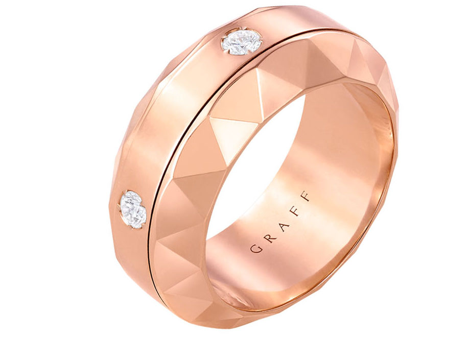 Il modello non è meno elegante e rispettabile. anello da uomo della collezione Classic della casa di gioielli Graff. Il prodotto è realizzato in oro rosa, decorato con diamanti e incisione logata del marchio.