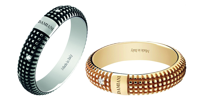 Aspetto molto straordinario e moderno modelli di fedi nuziali da uomo della serie Metropolitan della casa di gioielli italiana Damiani. Una caratteristica sorprendente di questi prodotti è la loro superficie goffrata e appuntita. Il gioiello è decorato con diamanti e inciso con il nome del marchio.