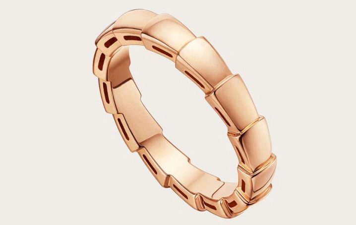 Un esempio di design discreto, ma allo stesso tempo originale è modello di fede nuziale da uomo Serpenti del marchio Bulgari. Il prodotto è realizzato in oro rosa sotto forma di squame stilizzate in pelle di serpente.