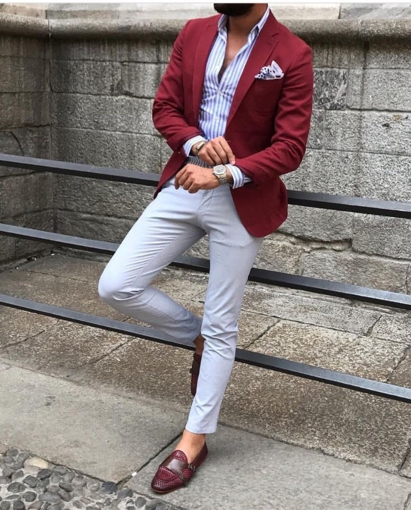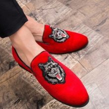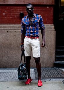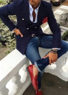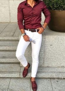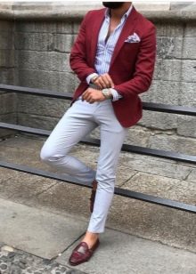 - Rosso. Questi mocassini da uomo sono un po' provocatori. Si consiglia di combinarli con cose più neutre, ad esempio con magliette bianche come la neve, abiti blu scuro.
