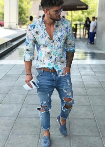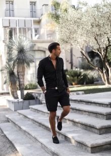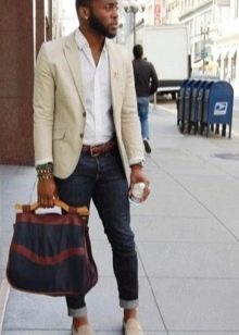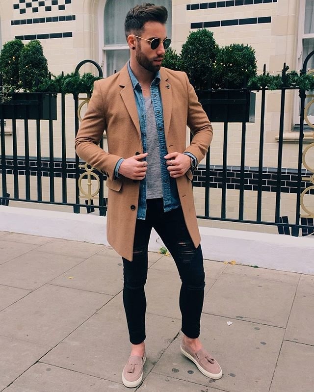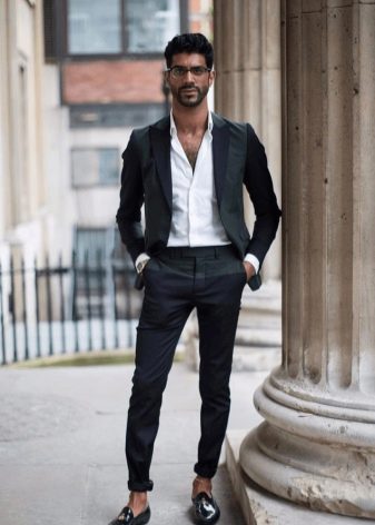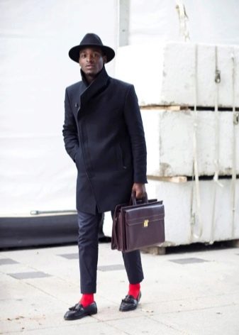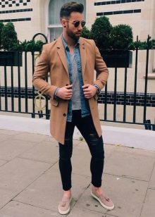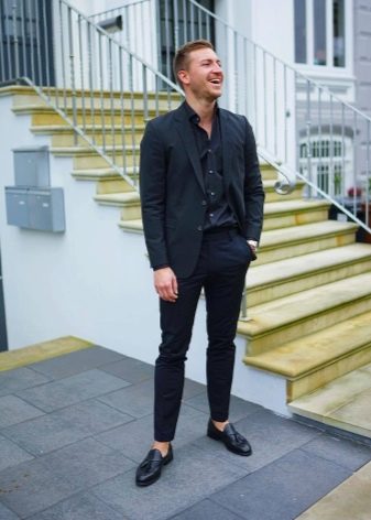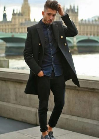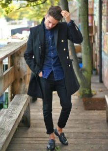 - Un look straordinariamente maschile e sexy può essere combinato con mocassini neri opachi con fibbia dorata, pantaloni scuri skinny, una camicia di jeans e un lungo cappotto nero con bottoni dorati. È improbabile che un uomo con un vestito del genere venga lasciato senza l'attenzione degli altri.